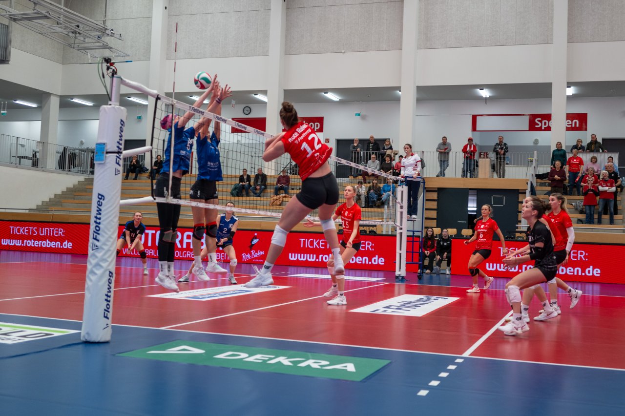 Aber die Raben steigerten sich erneut und ließen sich durch die anfängliche 6:4-Gästeführung nicht aus der Ruhe bringen. Maja Feuerlein und Doleres Godoy Pastore sorgten für die erste Rabenführung (7:6). Bis zum 20:20 wogte die Begegnung mit wechselnden Führungen hin und her, bevor die Gastgeberinnen mit Leni Tiefenbeck an der Aufschlaglinie und Kathrin Polster, die in der Schlussphase drei Punkte beisteuerte, der Satzausgleich gelang. Auch im Tiebreak gaben zunächst die Raben den Ton an, gingen von Beginn an in Führung und behielten diese bis zum 12:10. Aber sie konnten das Niveau nicht halten, denn nach einer von Dirk Lommatzsch genommenen Auszeit, setzte sich seine Mannschaft auf 14:12 ab. Maja Feuerlein konnte zwar noch einmal verkürzen, aber die überragende Außenangreiferin Susanne Besa erzielte das 15:13.
