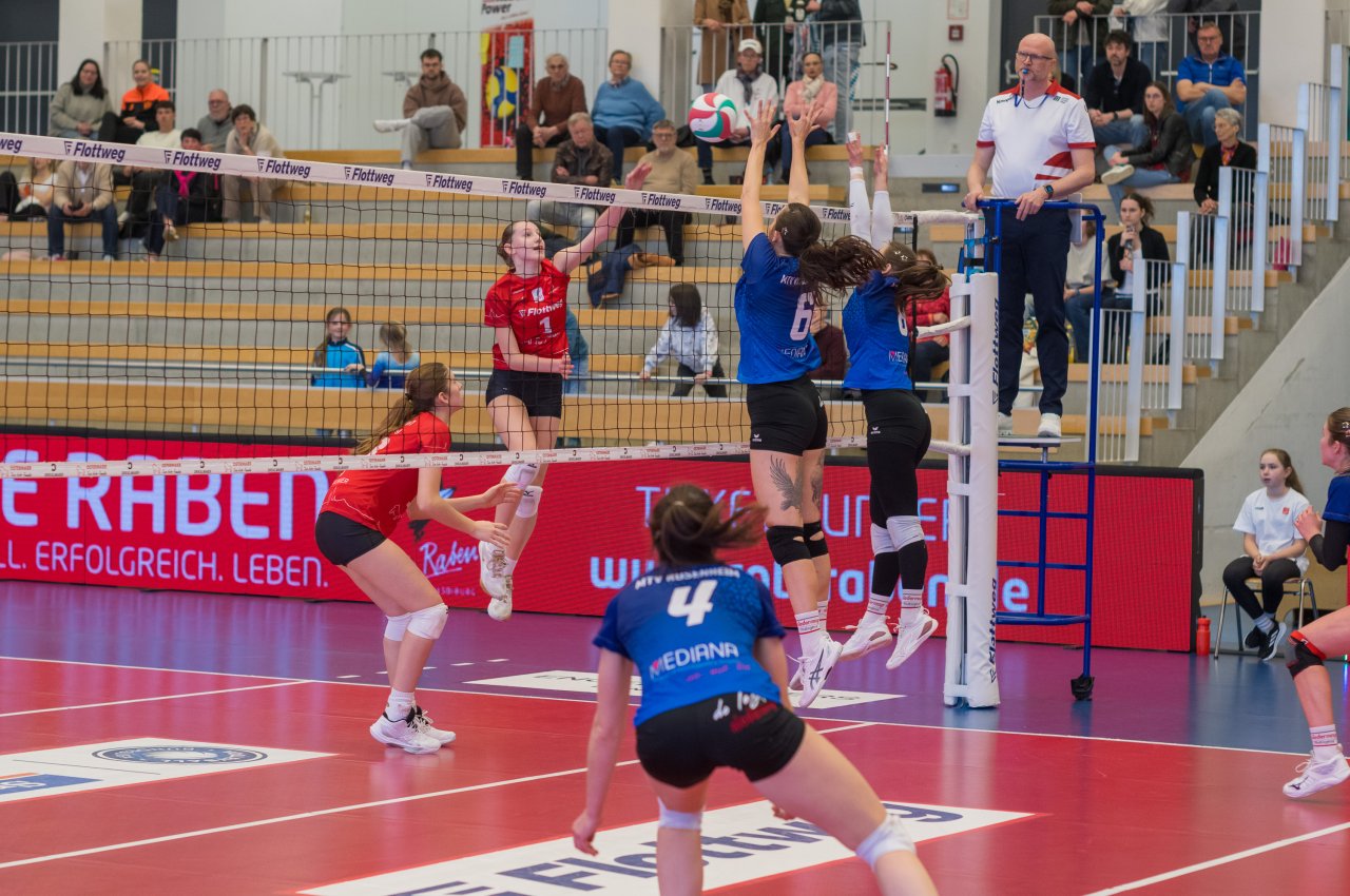 Und die Mädchen um MVP Katharina Weinzierl nahmen den Schwung auch in den zweiten Abschnitt mit. Sie holten den anfänglichen Erlangener Vorsprung auf und bauten die Führung mit Regina Eberl an der Aufschlaglinie von 12:10 auf 16:10 aus. Zwar schmolz anschließend der Vorsprung, aber bis zum 21:20 war der zweite Satzgewinn greifbar nahe. In der Crunchtime agierten die Gastgeberinnen konsequenter und machten vier Punkte zum 24:21. Diana Vavrek gelang noch das 23:24, doch brachte ein cleverer zweiter Ball den Satzausgleich.