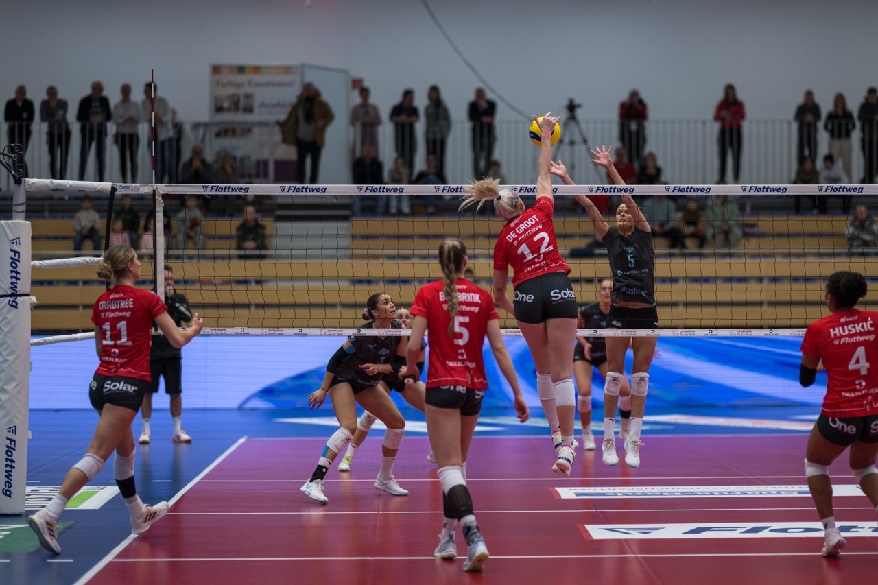 Gerade im ersten Satz war Tina de Groot eine der auffälligsten Spielerinnen im Rote Raben-Trikot, die mit ihren Punkten immer wieder dafür sorgte, dass die Roten Raben in der Partie blieben. Denn sie begannen alles andere als erfolgversprechend: Beim 0:4 musste Raben-Trainer Guillermo Gallardo bereits seine erste Auszeit nehmen und seine Spielerinnen ermahnen, endlich mehr Zug in ihr Spiel zu bringen. Schwächen in der Annahme, aber auch in der Abstimmung innerhalb des Teams sorgten dafür, dass die Gäste aus Düsseldorf immer in Schlagweite blieben.