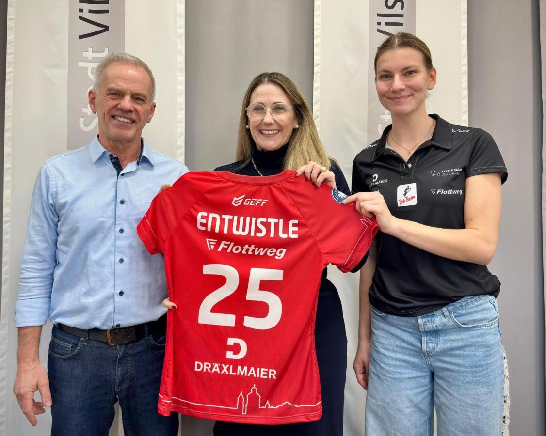 Dabei ist dann auch der Gedanke aufgekommen, Vilsbiburg als ihre Heimat in den Vordergrund zu stellen. Ein äußeres Zeichen ist das Trikot, dass die Spielerinnen der Roten Raben tragen. Aufmerksame Volleyballfreunde haben es natürlich schon bemerkt, dass am unteren Rand des Trikots sowie an den Ärmeln die Silhouette von Vilsbiburg abgebildet ist. Seit kurzem ist auch Bürgermeisterin Sibylle Entwistle stolze Besitzerin eines solchen Trikots, das ihr von Raben-Geschäftsführer Harald Giglberger und der Spielführerin der ersten Mannschaft der Roten Raben, Pia Fernau, im Rathaus übergeben wurde. Beide stehen exemplarisch für die Kombination Rote Raben und Vilsbiburg.