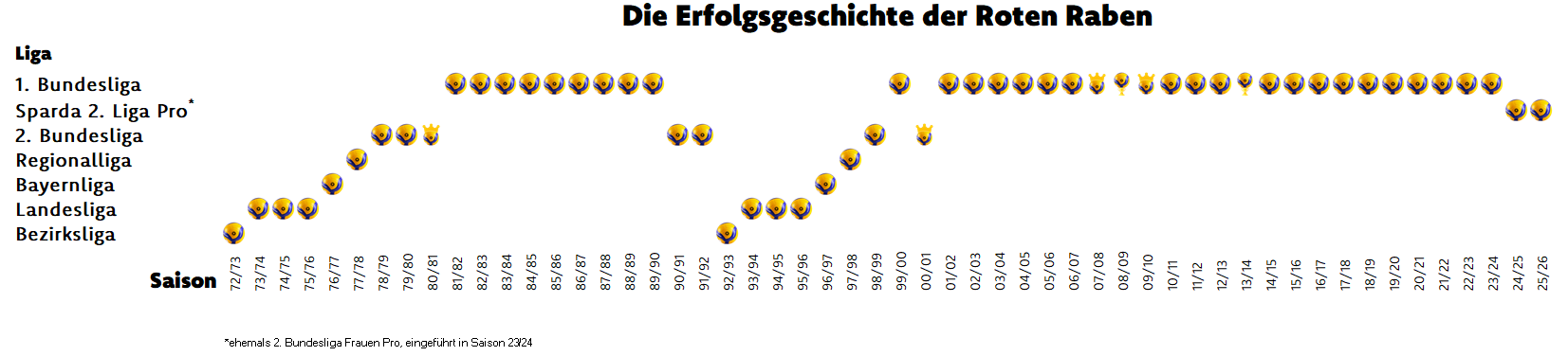Die Verantwortlichen haben sich dazu entschieden einen Cut zu machen. Die Roten Raben zogen sich aus der ersten Bundesliga zurück und traten in der Saison 2024/25 erstmals in der jungen 2. Liga Pro an. Es war ein konsequenter Schritt, um die finanzielle Konsolidierung voranzutreiben. Gleich in der ersten Saison sorgten die Roten Raben in der 2. Liga Pro für ordentlich Furore. Unter der Führung von Trainer Alberto Chaparro startete die Mannschaft, die souverän in der 2. Liga Süd den Meistertitel geholt hatte. Sie wurde punktuell verstärkt und schaffte am Ende auf Anhieb den Vizemeistertitel. Dennoch entschieden die Verantwortlichen, in der 2. Liga Pro, die seit der Saison 2025/26 Sparda 2.Liga Pro heißt, zu bleiben. Die wirtschaftliche Konsolidierung und die sportliche Erholung von unten her, haben nach wie vor Priorität. Mit Erfolgstrainer Guillermo Gallardo an der Seitenlinie ist das neu zusammengestellte Team der Roten Raben aktuell auf einem erfolgreichen Weg; und grüßt von der Tabellenspitze. |